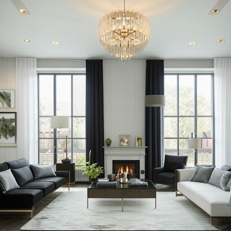 Вертикальная симметрия применяется, когда высота потолков превышает стандартную, путем использования длинной люстры для создания баланса. На уровне глаз размещаются картины или другие декоративные элементы.