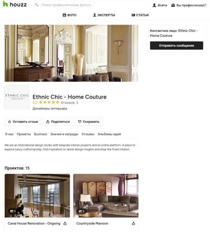 Маркетплейс Houzz — это настоящий инструмент для профессионалов. Заказчики могут детально изучать портфолио, анализировать отзывы и фильтровать предложения по стилю, локации и бюджету. Платформа работает в глобальном масштабе, включая русскоязычную версию, что делает её универсальным инструментом для дизайнеров из разных стран.