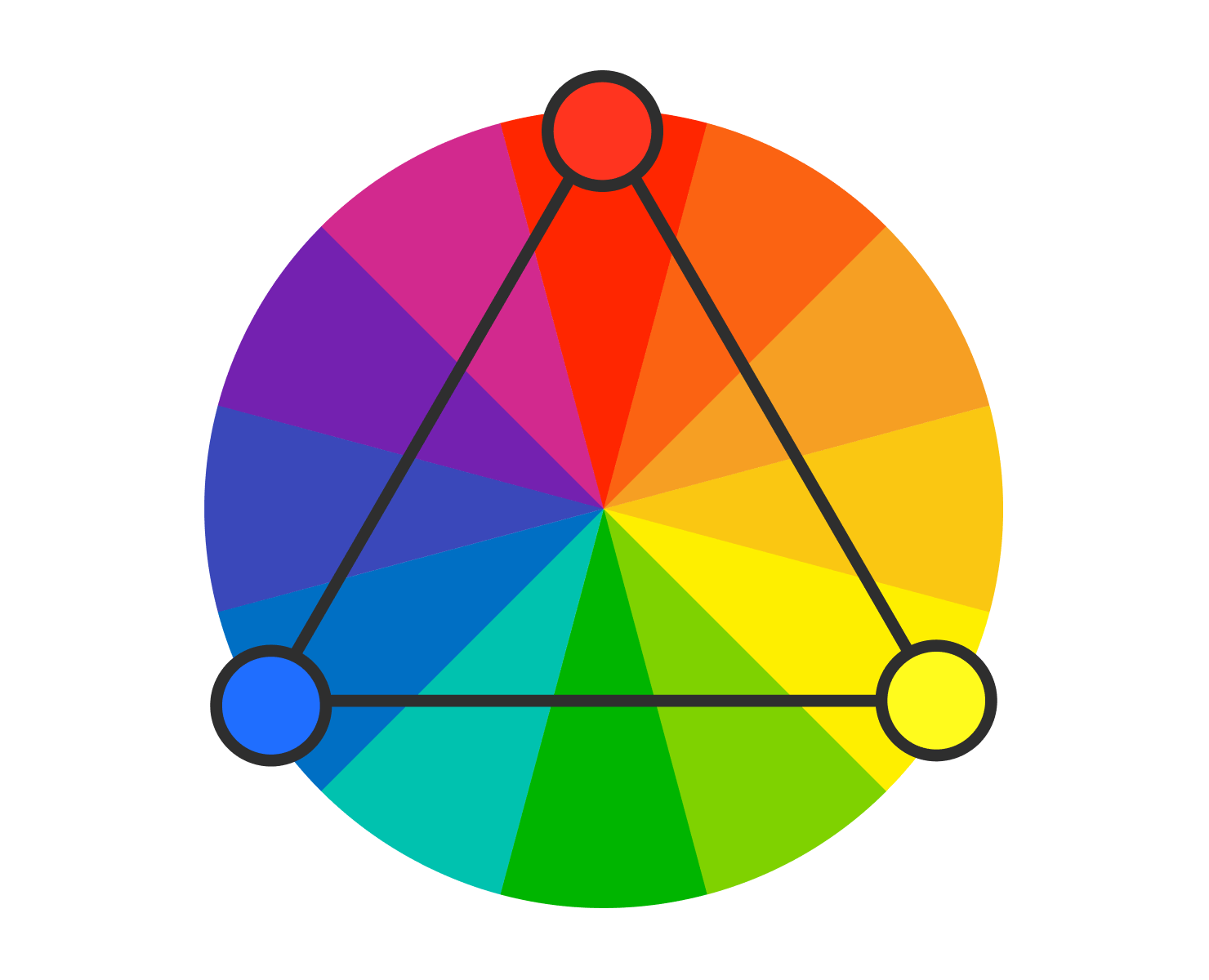 - Треугольник (триада). Выбираются три равноудаленных друг от друга оттенка на круге. Это создаёт яркое и динамичное сочетание, которое часто используется в графическом дизайне и моде.