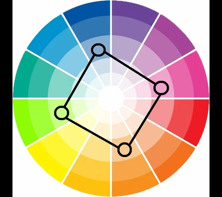 - Контрастная квадратная тетрада. Выбираются четыре равноудалённых друг от друга цвета на цветовом круге, красный, жёлто-зелёный, голубой и фиолетово-розовый. Такая схема создаёт сбалансированное и гармоничное сочетание, подходящее для сложных дизайнов.