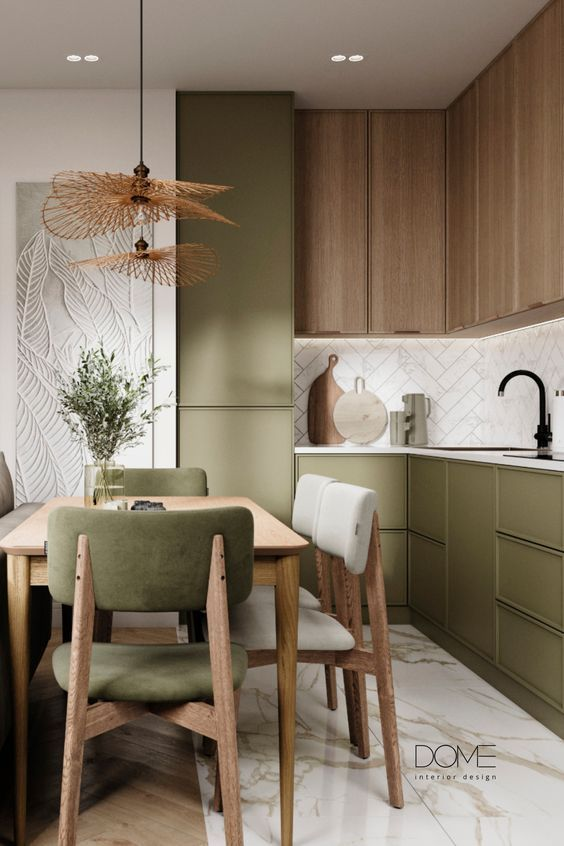 Выбор цветового сочетания для кухни зависит от её размеров: в компактных помещениях предпочтение следует отдавать светлым оттенкам. Также важно не перегружать пространство — оптимальным будет ограничиться одним ярким цветом или двумя дополнительными, чтобы избежать визуального беспорядка и пестроты. Поэтому для этой комнаты лучше подобрать светлые и теплые оттенки, такие как кремовый, желтый или оливковый. Они создают уютную атмосферу и стимулируют аппетит. Также можно использовать яркие акценты, красный или синий, чтобы оживить пространство.