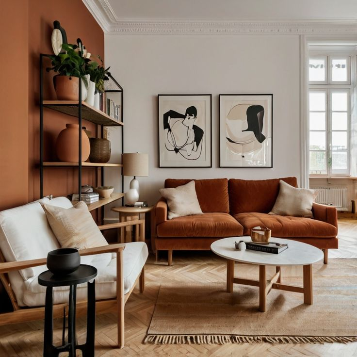 Гостиная — это место для общения и отдыха. Здесь можно использовать более насыщенные цвета, такие как терракотовый, морской синий или изумрудный.