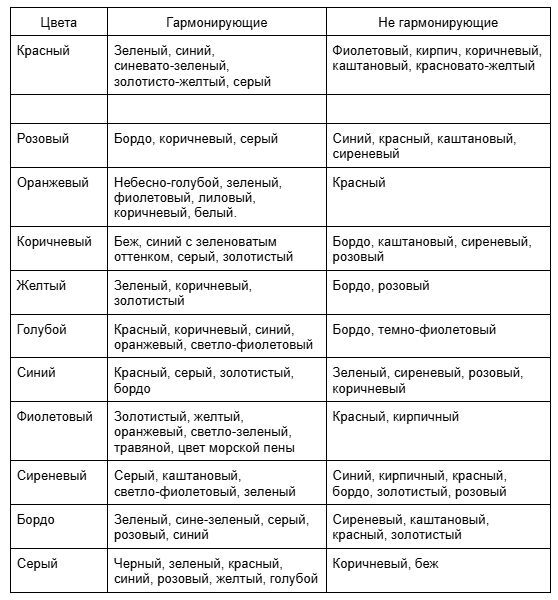 Таблица сочетаемости цветов в интерьерах разных стилей